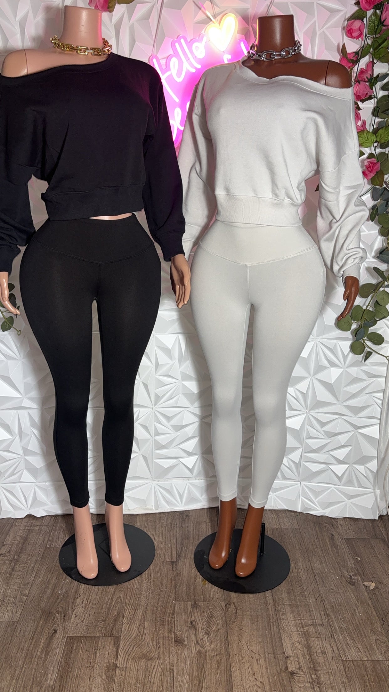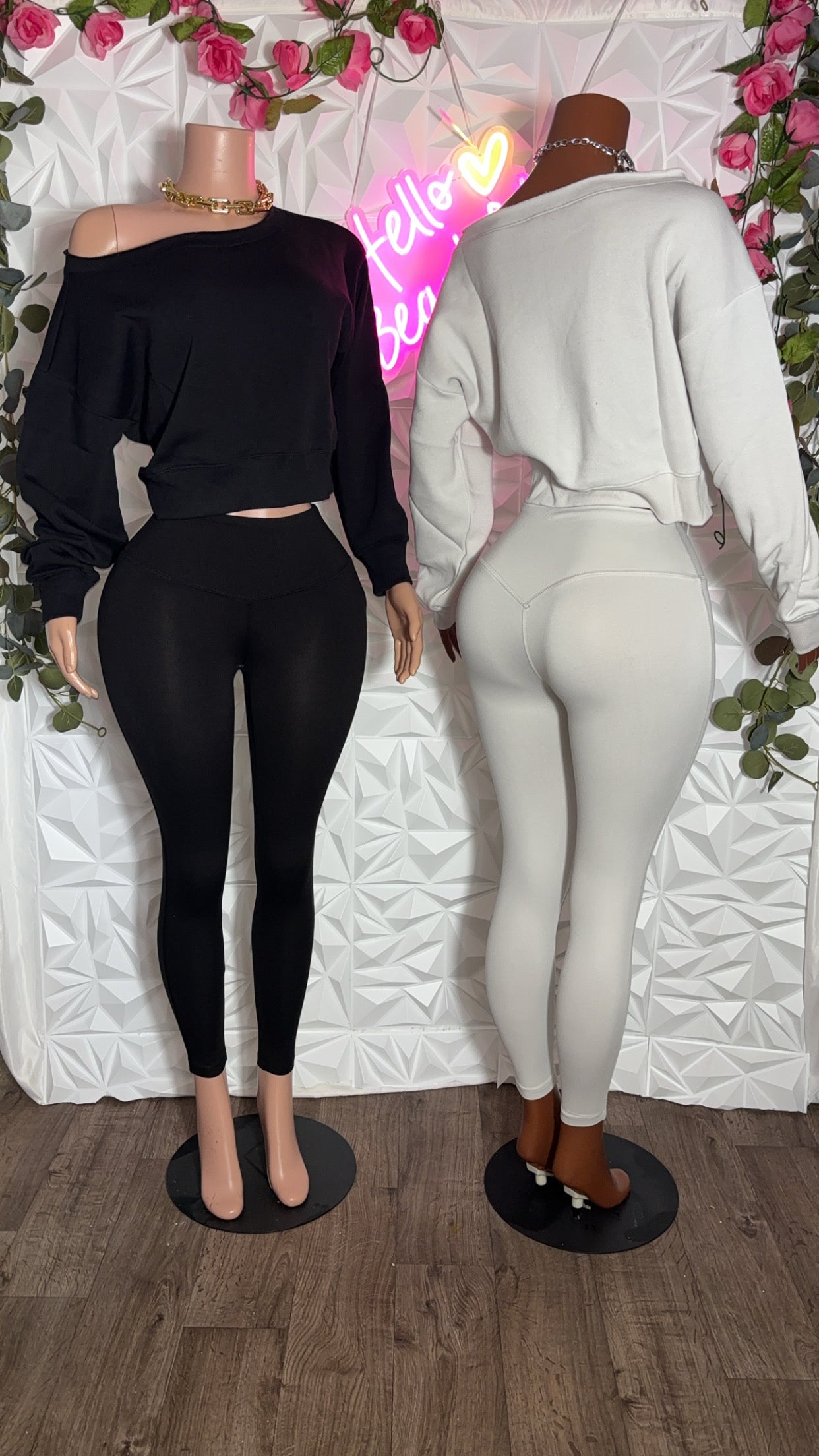 I HAVE THE SWEATSHIRT CINCHED IN TO GIVE TIGHTER FIT. IT IS LOOSE AROUND THE WAIST. LEGGINGS DO NOT ROLL DOWN. THESE ARE QUALITY LEGGINGS.